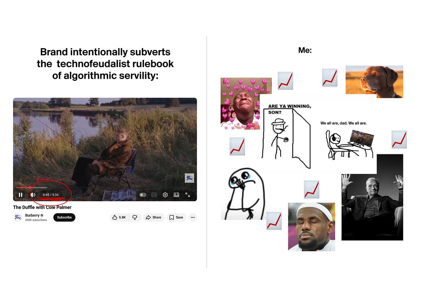The thing that makes Burberry a friction-forward brand isn’t the fact that they’re de-blanding their visual identity, it’s the fact that they produced a 9-minute long video of Cole Palmer where nothing happens. It’s refusing to shrug shoulders at shortening attention spans and challenging users to sit with tougher material. A blatant disregard for the playing field and how to “optimize” it. That’s where friction comes in.