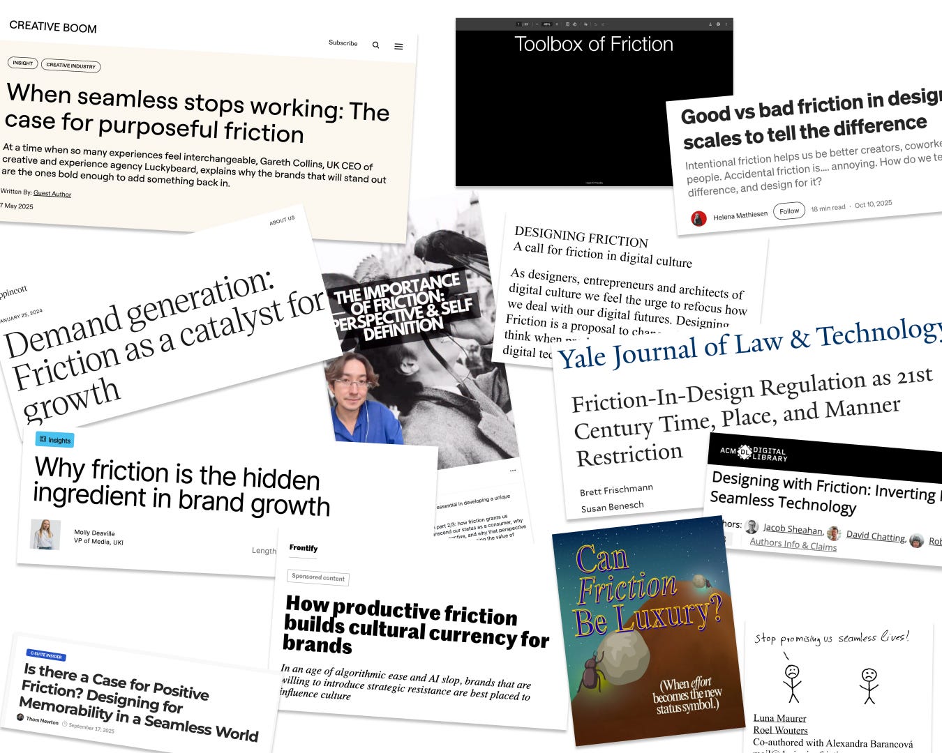 Friction alone won’t solve all your brand or design problems. It comes in good and bad flavors. But by breaking friction down into physical, intellectual, and emotional manifestations, brands can start to consider how to free their users from the shackles of doomscrolling optimizations and efficiencies. Designing Friction is a great aide in this process as well, outlining several practical translations for what this could look like in-situation for brands and experiences.