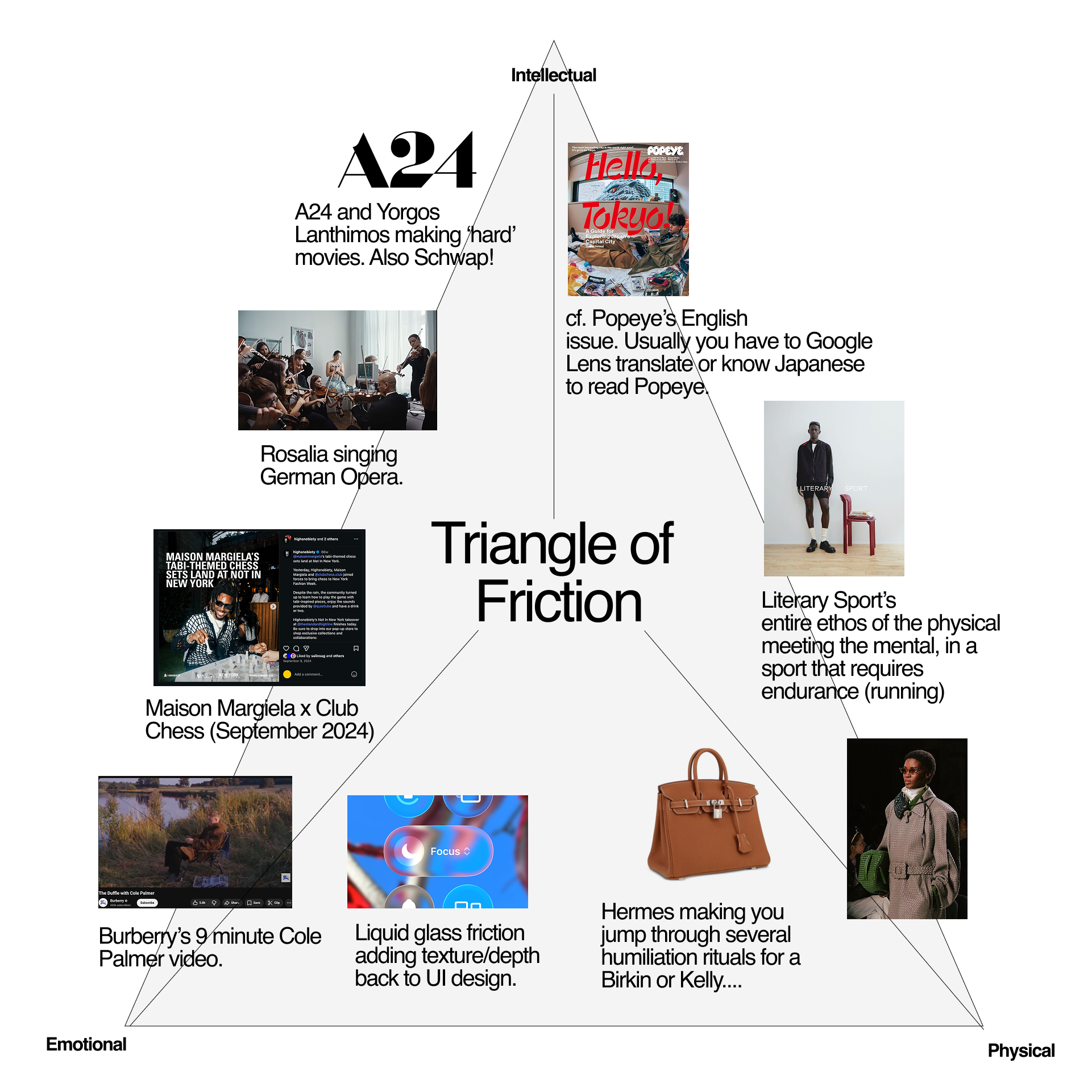 The thing that makes Burberry a friction-forward brand isn’t the fact that they’re de-blanding their visual identity, it’s the fact that they produced a 9-minute long video of Cole Palmer where nothing happens. It’s refusing to shrug shoulders at shortening attention spans and challenging users to sit with tougher material. A blatant disregard for the playing field and how to “optimize” it. That’s where friction comes in.