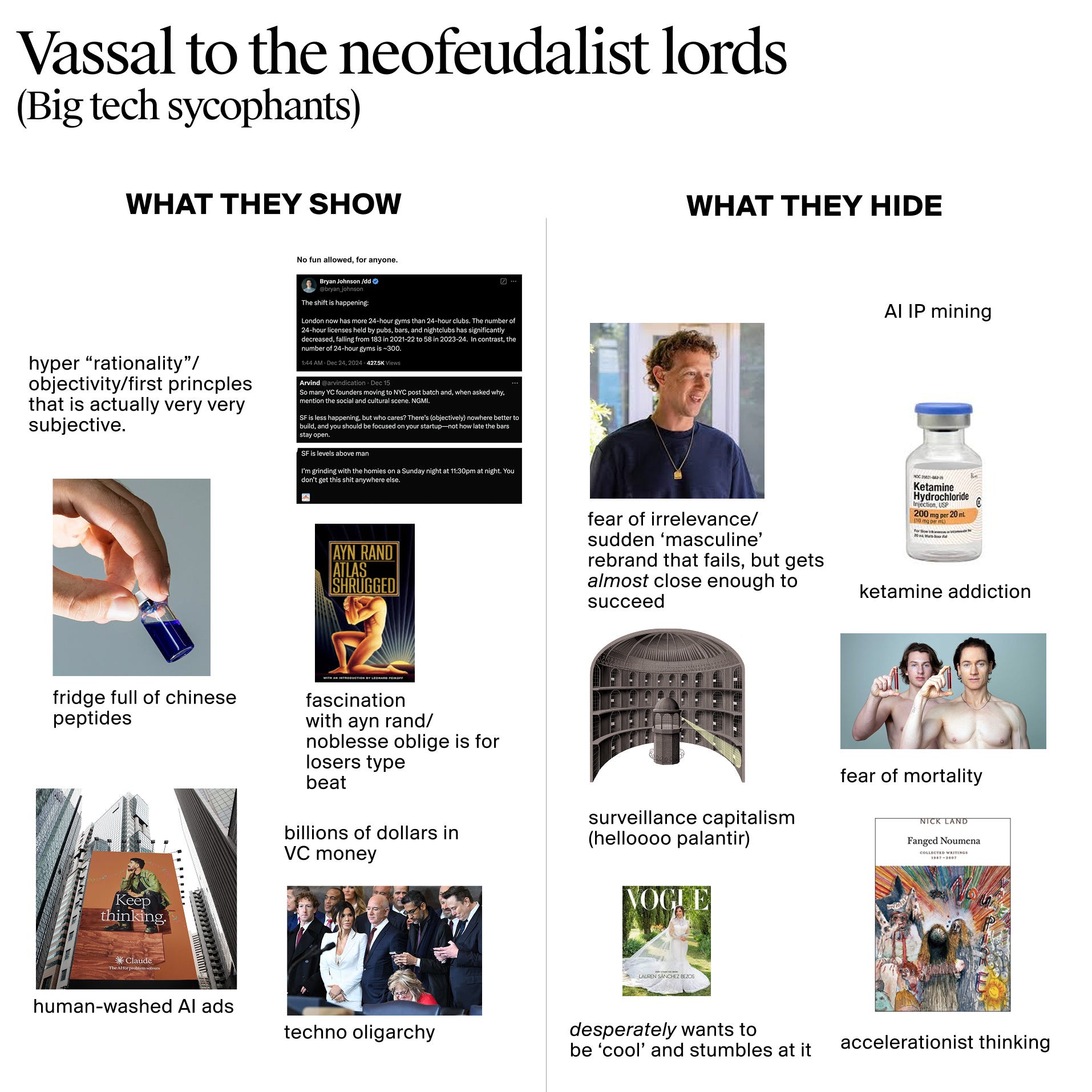 There are surprisingly-obvious analogues for our newfound feudal condition. In today’s feudalism, AI is our God, the Algorithm, our church. Food scarcity comes in the form of overpriced small plates. Podcasters are the town crier and shitposters are the court jester. Layer in the real-world impact of tariffs, rising inflation, a stagnant job market, and both domestic and international conflict, and it’s all there.